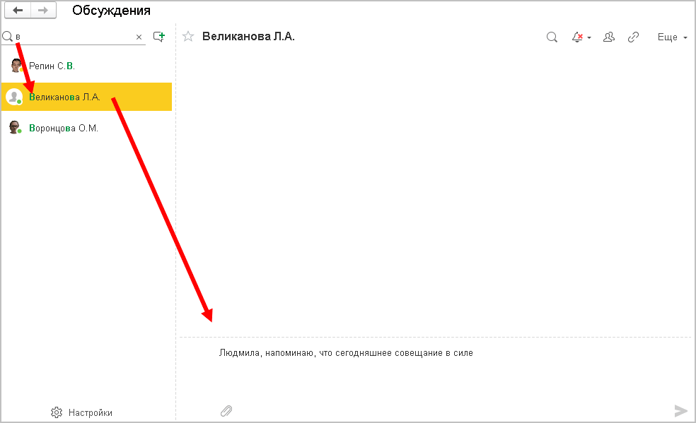 Откройте Обсуждения. В поле Поиск по темам и пользователям начните вводить фамилию коллеги. Выберите его из предложенных программой и пишите сообщения.