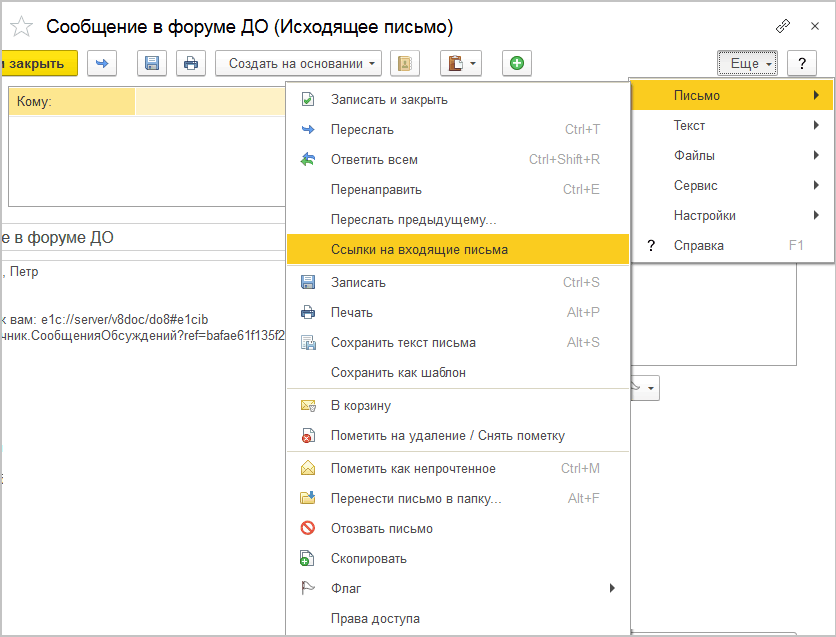 Удобно скопировать ссылку на входящее письмо у другого сотрудника, чтобы он не искал его в почте. Например, так: «Посмотри письмо ххх, я писал тебе в июне». Это делается так: Еще – Письмо – Ссылка на входящие письма.