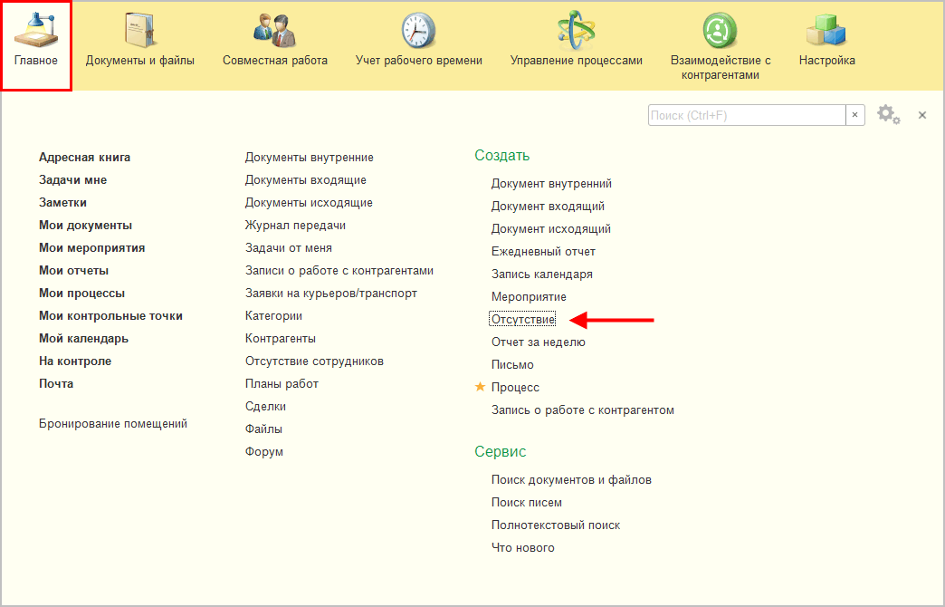 Чтобы ввести информацию об отсутствии выполните команду Создать – Отсутствие в меню разделов Рабочий стол, Совместная работа или списке отсутствий.
