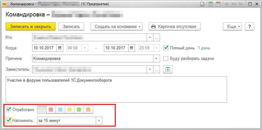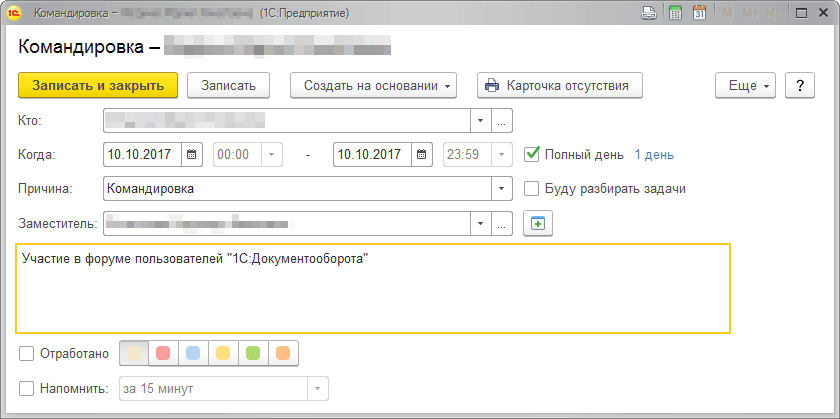 Включить напоминание и выбрать цвет записи календаря можно прямо из карточки отсутствия.