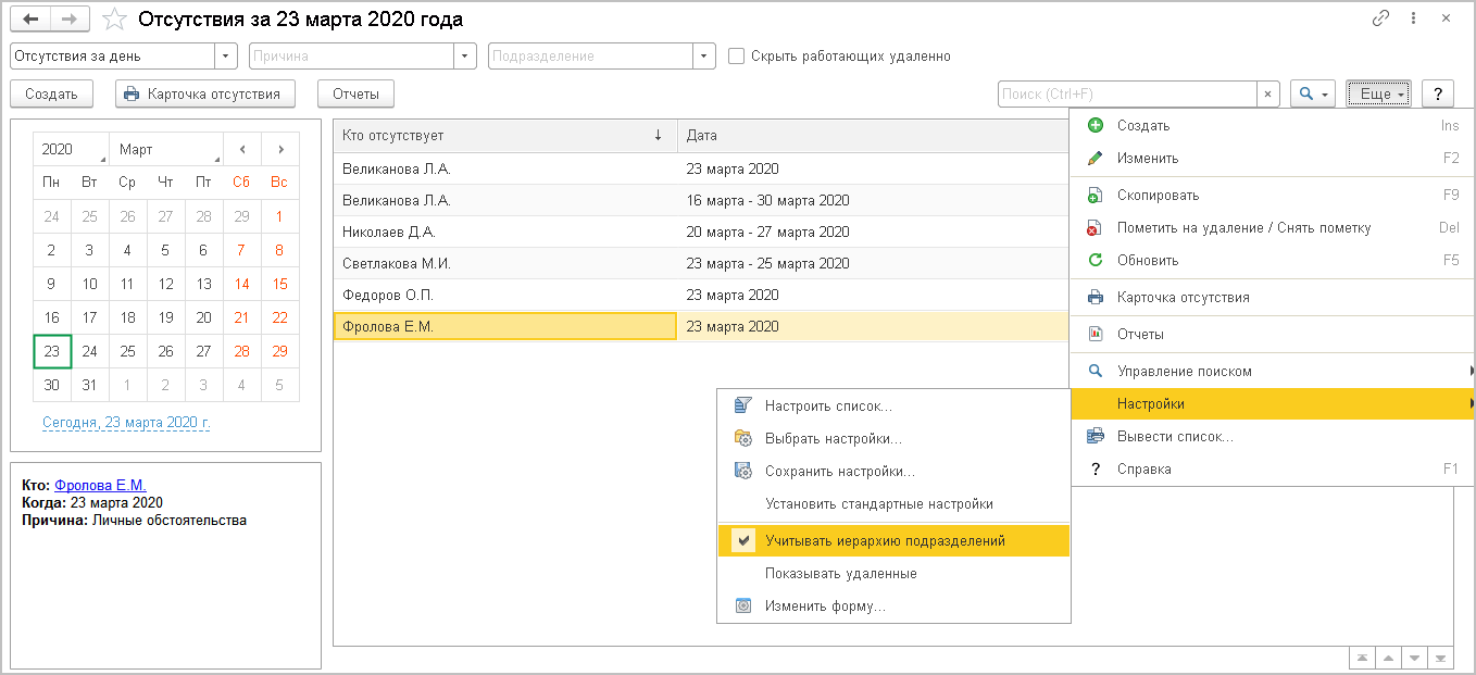Для удобной работы в отделах и группах по команде Еще – Настройки доступна команда Учитывать иерархию подразделений.