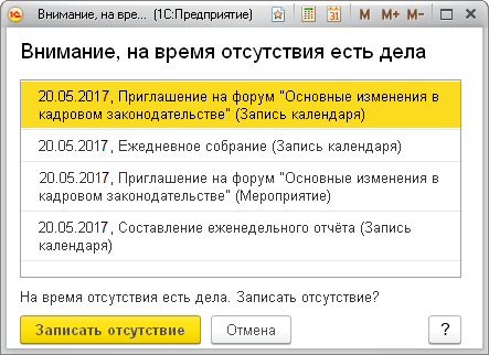 Если на указанное время уже запланированы дела, программа покажет список этих дел. При этом рекомендуется внимательно ознакомиться с этим списком, перенести или отменить дела. Отсутствие может быть создано, несмотря на назначенные ранее дела.
