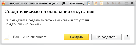 Если флажок Больше не спрашивать установлен, то программа запомнит выбранное действие и будет выполнять его при создании дальнейших отсутствий. Изменить такое поведение можно в персональных настройках программы.