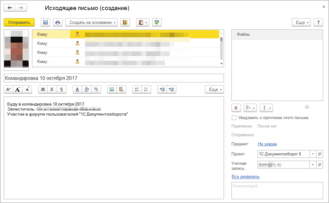 В список адресатов письма автоматически добавляются: заместитель отсутствующего, руководитель, все сотрудники его отдела. До отправки письма список адресатов можно редактировать.
