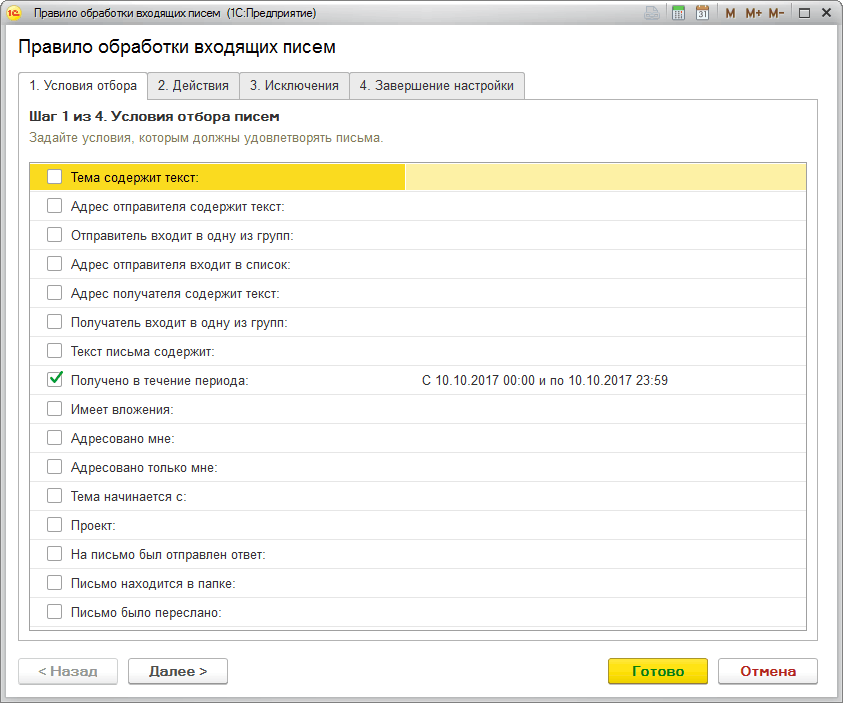 На первом шаге отметьте условия, по которым правило будет обрабатывать письма, и укажите их значения. Например, укажите период отсутствия в условии Получено в течение периода. Если вы отметили несколько условий, то правило сработает только при выполнении всех этих условий (условия соединяются по принципу И).