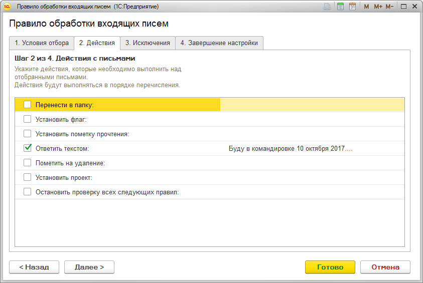 На втором шаге настройки укажите, какие будут выполняться с отобранными письмами. Например, впишите текст «В командировке до … По всем вопросам обращайтесь к…» в пункте Ответить текстом.