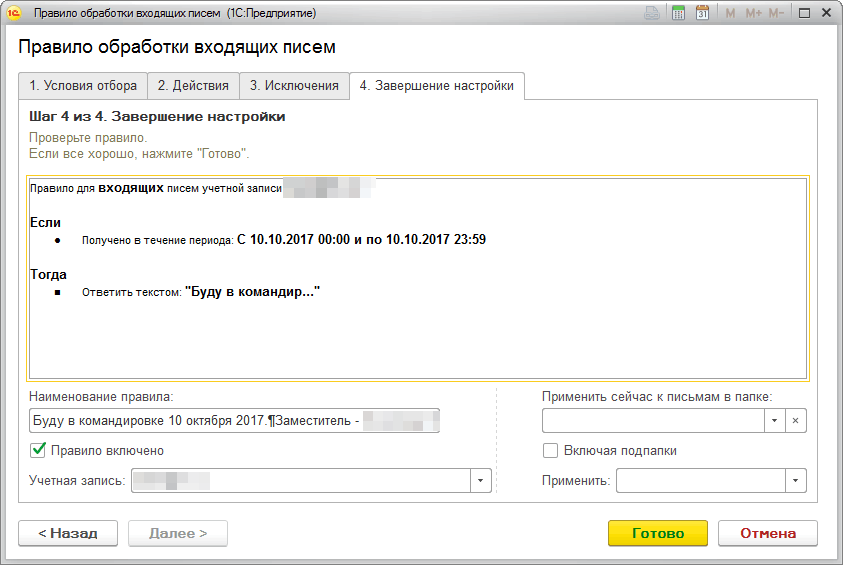На последнем шаге проверьте правильность всех условий и действий. Для этого выводится текстовое описание правила.