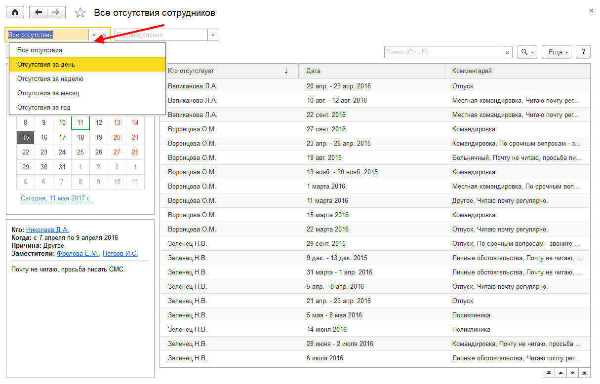 Чтобы посмотреть отсутствия за определенный период, используйте отбор в верхней части окна.