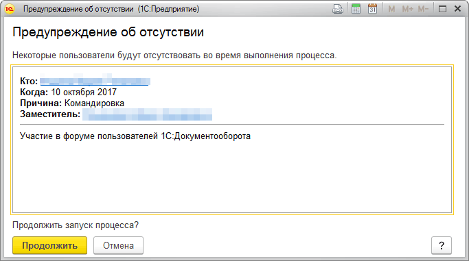 При каком-либо взаимодействии с отсутствующим сотрудником (например, если вы указали его адресатом письма или назначили исполнителем задачи) вы получите предупреждение с указанием причины отсутствия и именем заместителя.