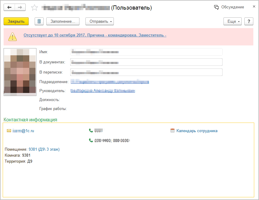 Информация об отсутствии сотрудника на рабочем месте отображается в карточке пользователя, в адресной книге и в календаре.