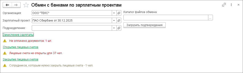 - загрузить подтверждение из банка о результатах открытия лицевых счетов (из переданного банком файла);