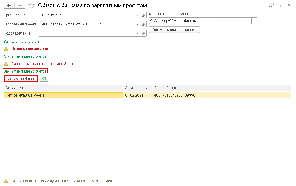 Если в зарплатном проекте указан формат файла не ниже версии 3.3, то в форме обработки становится доступным раздел Закрытие лицевых счетов для проведения работ по закрытию лицевых счетов. Для выплаты зарплаты с использованием зарплатного проекта установите формат файла версии 3.6 для обмена с банком. Табличная часть раздела заполняется уволенными сотрудниками, у которых есть открытые лицевые счета по выбранному проекту. При заполнении табличной части сотрудник считается уволенным, если у него не осталось ни одного рабочего места в организации. Выгрузка файла (заявки на закрытие лицевых счетов) производится при нажатии на кнопку Выгрузить файл (рис. 10). Дальнейшая работа с закрытыми лицевыми счетами не производится.