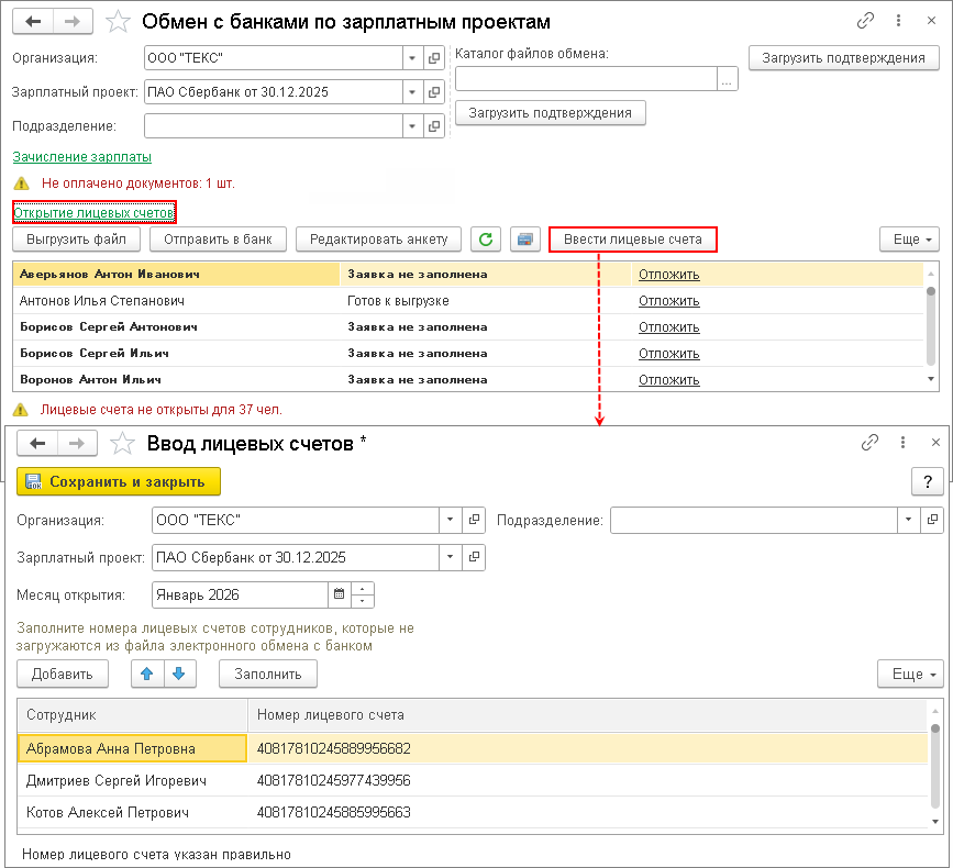 В случае если организация осуществляет обмен данными об открытии лицевых счетов с банком в электронном виде, то необходимо подготовить заявки на открытие лицевых счетов сотрудникам в банке в рамках зарплатного проекта для последующего перечисления зарплаты на лицевые счета. Для этого предназначен документ Заявка на открытие лицевых счетов: