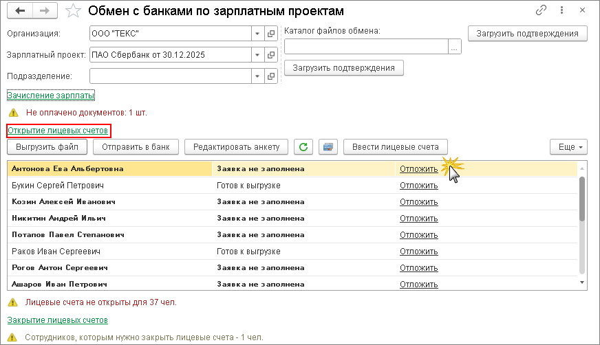 Если кому-то из сотрудников, отображенных в табличной части, не планируется открывать лицевые счета пока (например, не полностью заполнена анкета) или совсем (например, сотрудник получает зарплату через кассу), то заполнение заявки по ним можно отложить, нажав на ссылку Отложить (рис. 3).