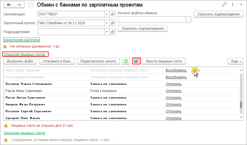 - открытие лицевых счетов вновь принятым сотрудникам, или сотрудникам, которые решили получать зарплату на карточки;
