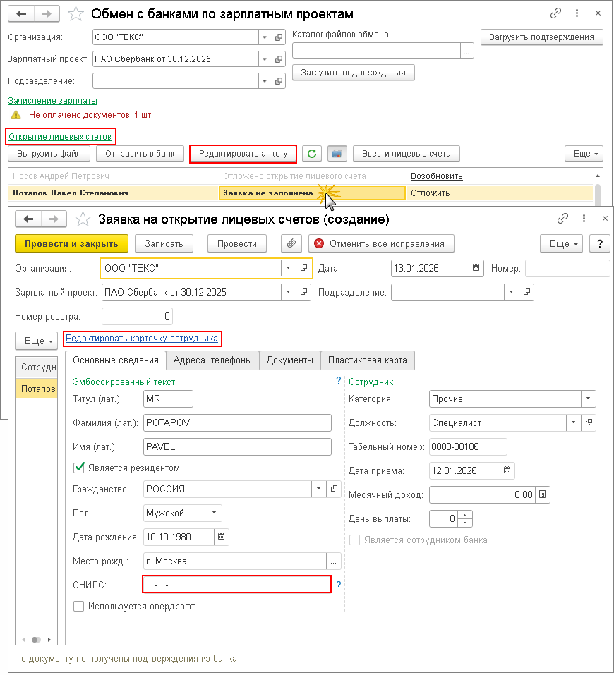 ; - на закладке Основные сведения поля Титул (лат.), Фамилия (лат.), Имя (лат.) заполняются автоматически. Остальные данные на закладках Основные данные, Адреса, телефоны, Документы также заполняются автоматически из личных данных сотрудника. На закладке Пластиковая карта заполняется дополнительная информация по пластиковой карточке сотрудника (тарифы за обслуживание пластиковой карточки, сумма пополнения лицевого счета, вид вклада и др.). Если какие-то личные данные сотрудника, необходимые для формирования заявки, не заполнены в обязательных для заполнения полях, то при проведении документа появится сообщение об ошибке и документ не будет проведен. Непосредственно из документа существует возможность перехода к редактированию данных сотрудника, нажав на ссылку Редактировать карточку сотрудника. Данные в полях, не являющихся обязательными для заполнения, заполняются в случае требования банка;