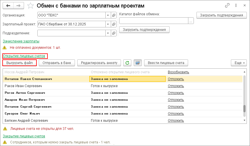 Когда все обязательные поля в Заявке на открытие лицевых счетов заполнены, в строке указывается, что сотрудник Готов к выгрузке. Документ Заявка на открытие лицевых счетов предварительно можно и не создавать. Документ может автоматически быть создан и проведен по готовым к выгрузке сотрудникам (не считая тех, по которым открытие лицевого счета отложено, – они не попадают в заявку) на текущую дату компьютера при нажатии на кнопку Выгрузить файл. По сотрудникам, заявка которых не заполнена, выгрузить ее в файл возможности нет.