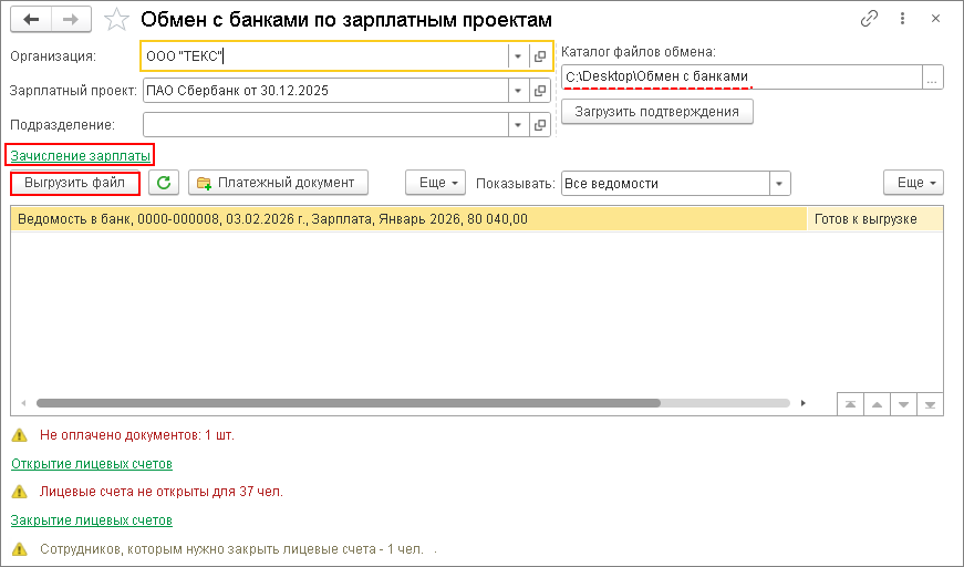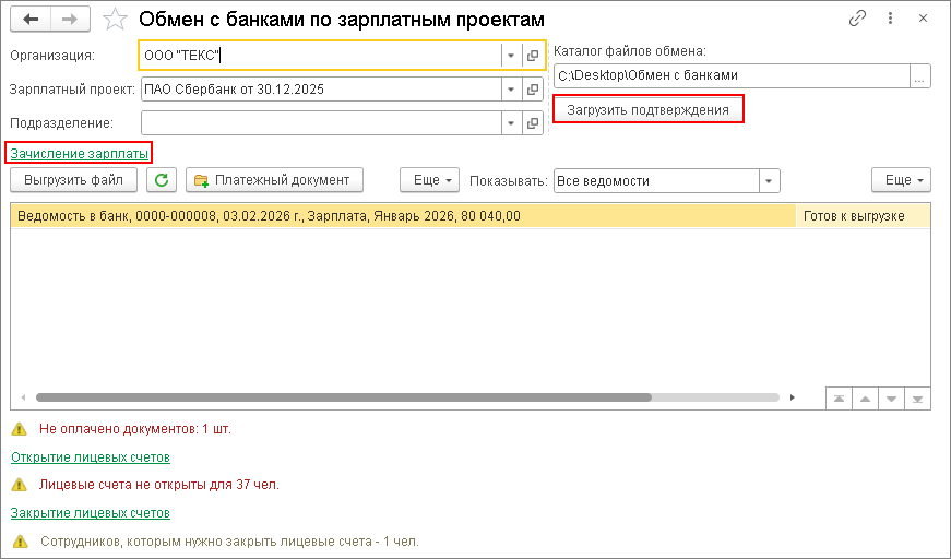 - Раздел Зарплата и кадры - Обмен с банками (зарплата).