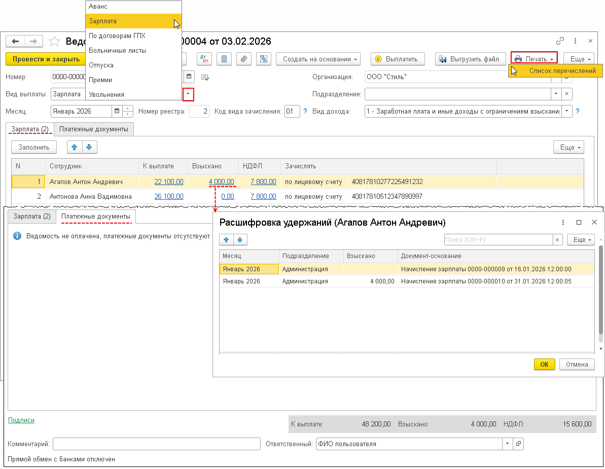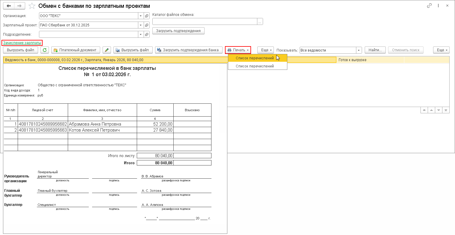 - сформировать печатную форму - список перечислений (для передачи его в банк);