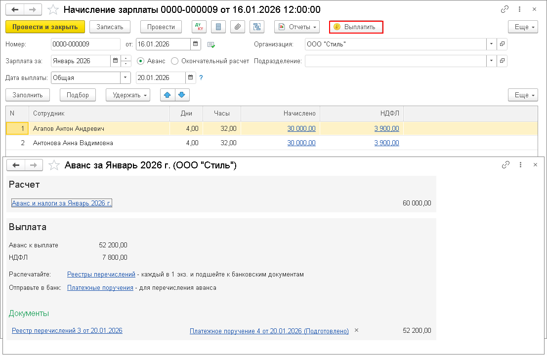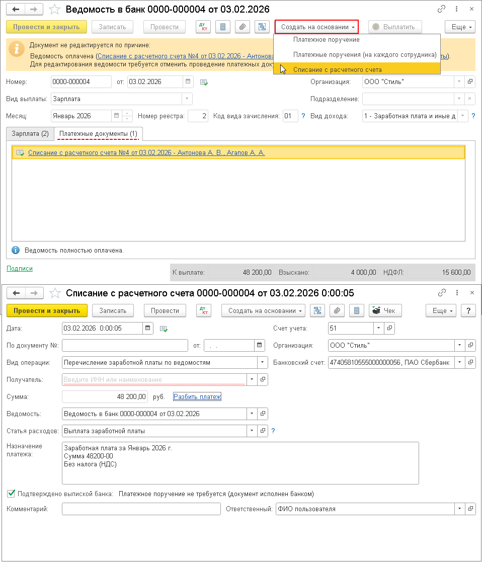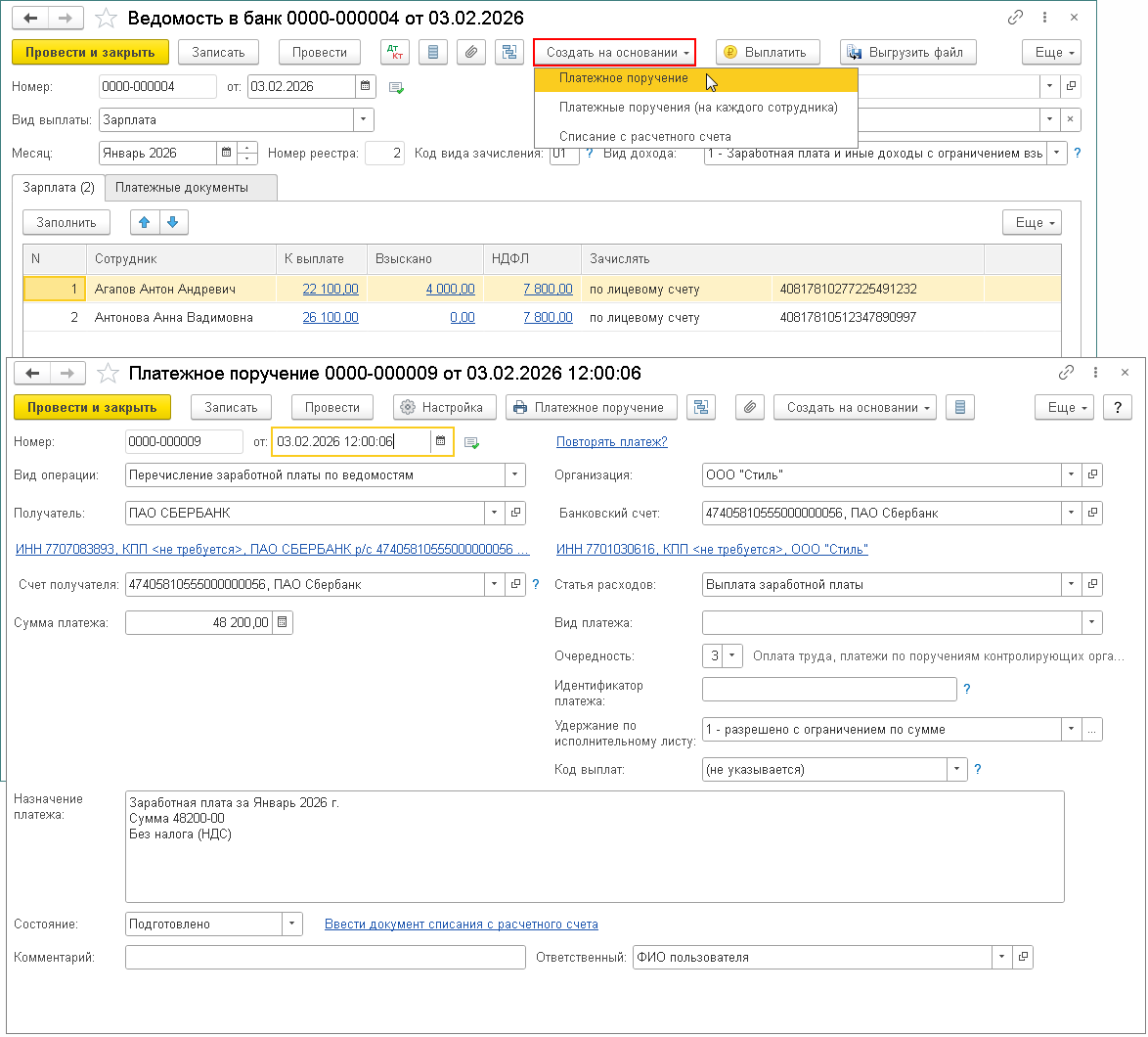 - Создание документа "Платежное поручение" на выплату зарплаты.