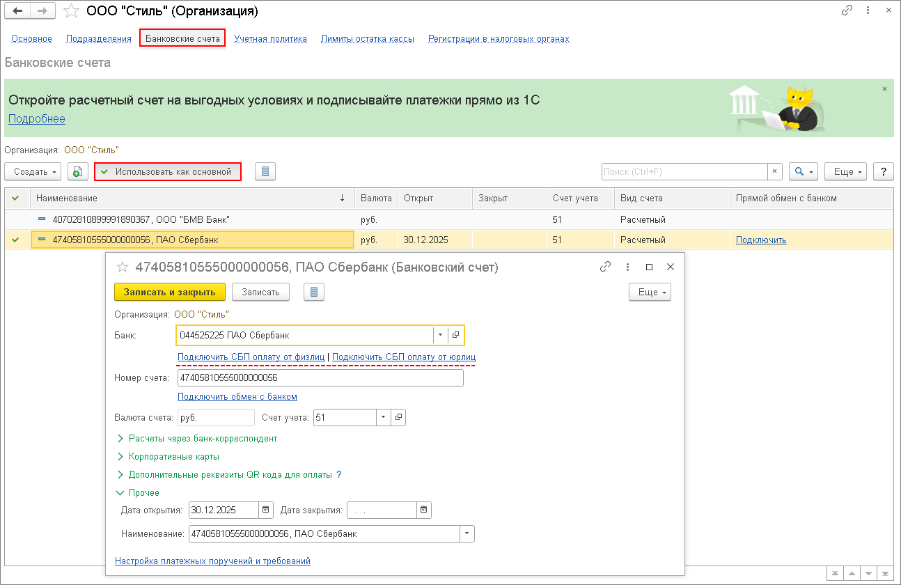 - Банковский счет (раздел Главное - Организации - закладка Банковские счета) - расчетный счет организации, с которого производится перечисление денежных средств (рис. 2). Если в организации используется электронный обмен с банком, который поддерживает технологию прямого обмена, по ссылке Подключить СБП оплату от физлиц или по ссылке Подключить СБП оплату от юрлиц можно начать процесс настройки. Подробнее об этом смотрите здесь.