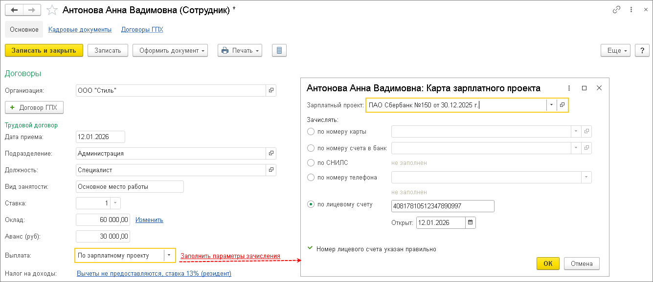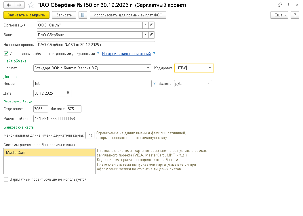 - в поле Зарплатный проект укажите договор организации с банком о перечислении денежных средств на лицевые счета сотрудников, открытые в этом банке;