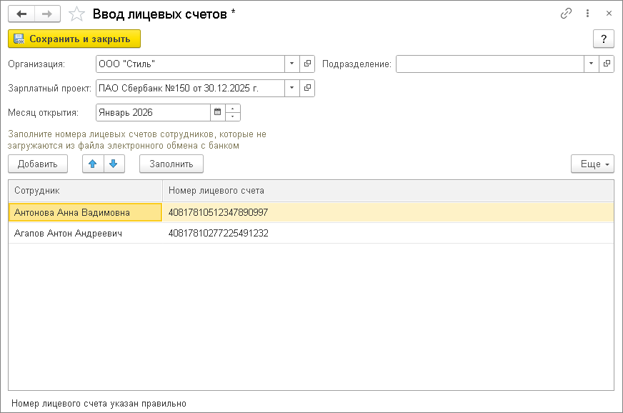 Ввод сведений о лицевых счетах сотрудников с помощью специальной формы Ввод лицевых счетов: