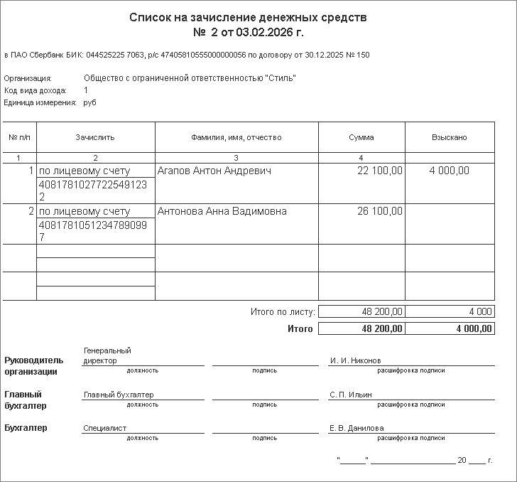 - Регистрация факта зачисления денежных средств на лицевые счета сотрудников.