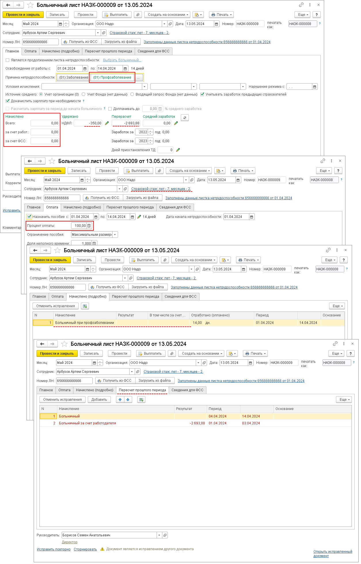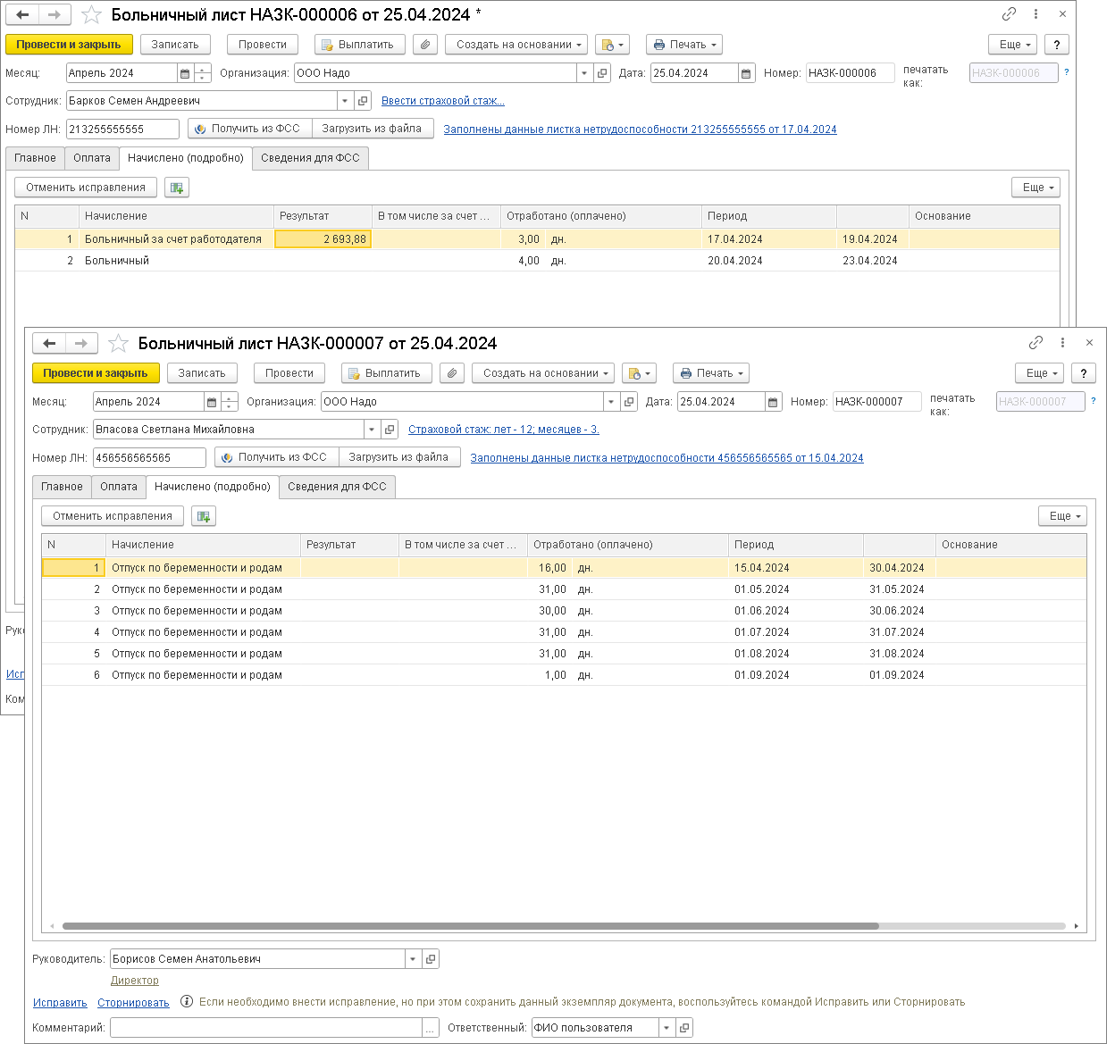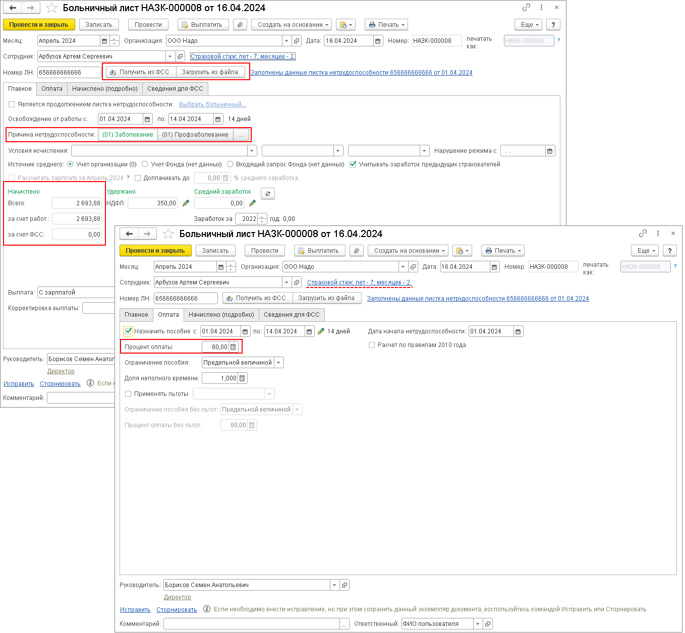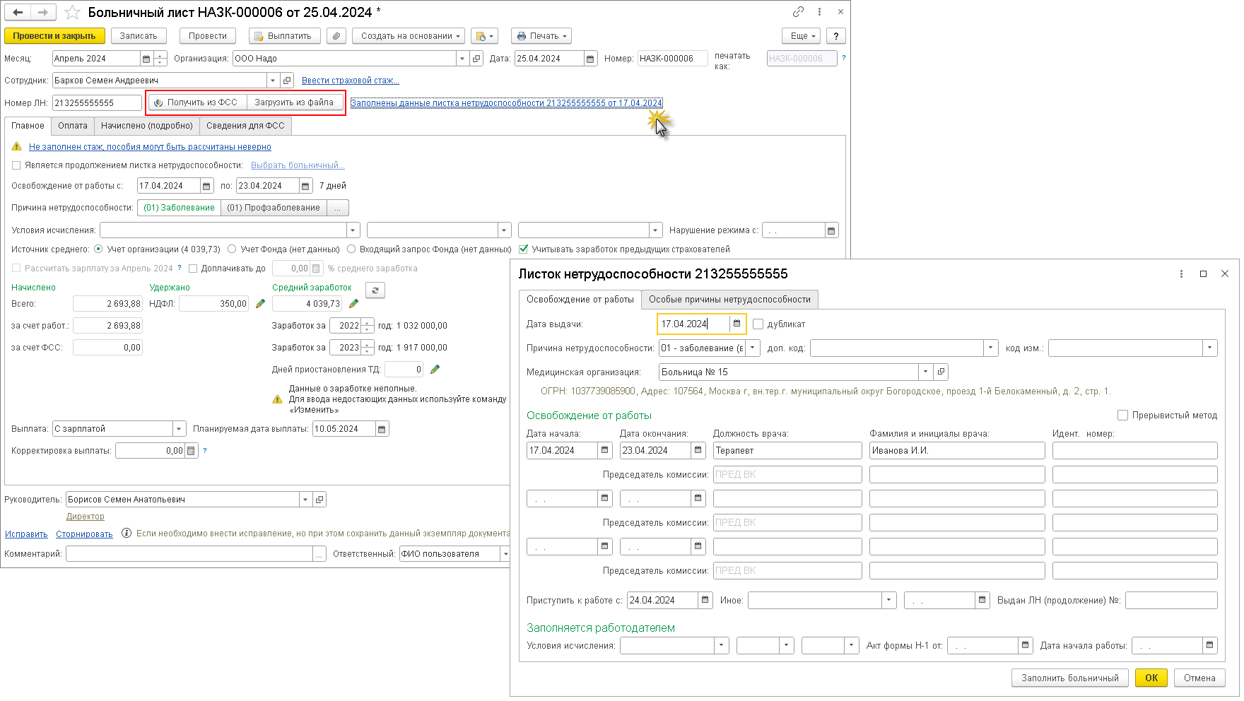 По кнопке Получить из ФСС документ автоматически заполняется данными ЭЛН (если документ создается автоматически, то он заполняется при первом открытии). Чтобы загрузить сведения ЭЛН из файла, выгруженного из личного кабинета страхователя на сайте СФР, нажмите на кнопку Загрузить из файла и выберите необходимый файл. По ссылке Заполнены данные листка нетрудоспособности в шапке документа можно увидеть, что данные листа заполнены автоматически (рис. 4).Рис. 4