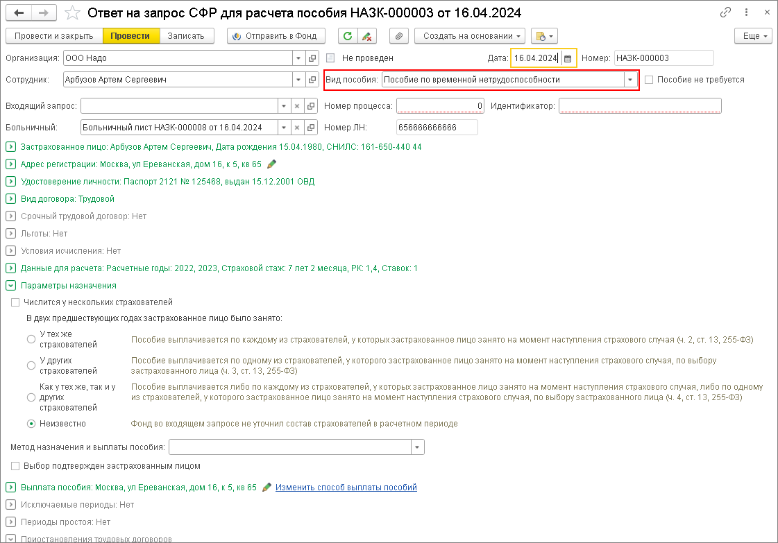 - Далее необходимо сформировать ответ фонду на его запрос. Для этого необходимо зарегистрировать документ Ответ на запрос СФР для расчета пособия. Документ можно создать из рабочего места Ответы на запросы СФР для расчета пособий (раздел Кадры), из документа Больничный лист или на основании входящего запроса от фонда по кнопке Создать на основании (рис. 6). Заполнение сведений в документе различается в зависимости от вида пособия. Можно непосредственно из программы отправить ответ в фонд по кнопке Отправить в Фонд.