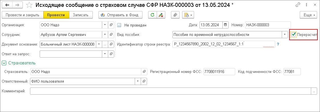 - Затем необходимо заново запустить проактивный процесс. Для этого отправьте в СФР сообщение с помощью документа Исходящее сообщение о страховом случае СФР (раздел Кадры – Исходящие сообщения о страховых случаях СФР или из документа Больничный лист по кнопке Создать на основании). В документе установите флажок Перерасчет (рис. 15).