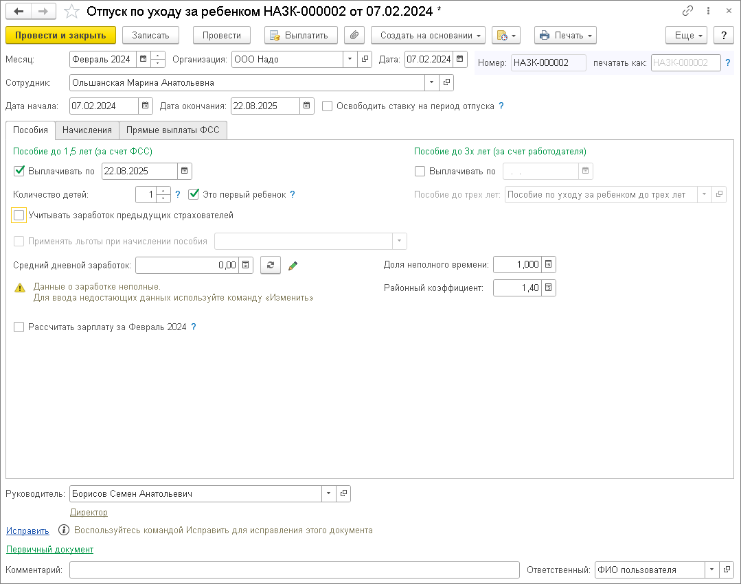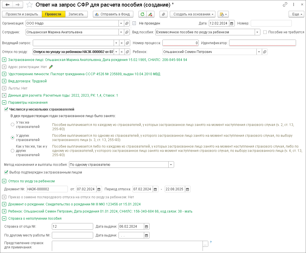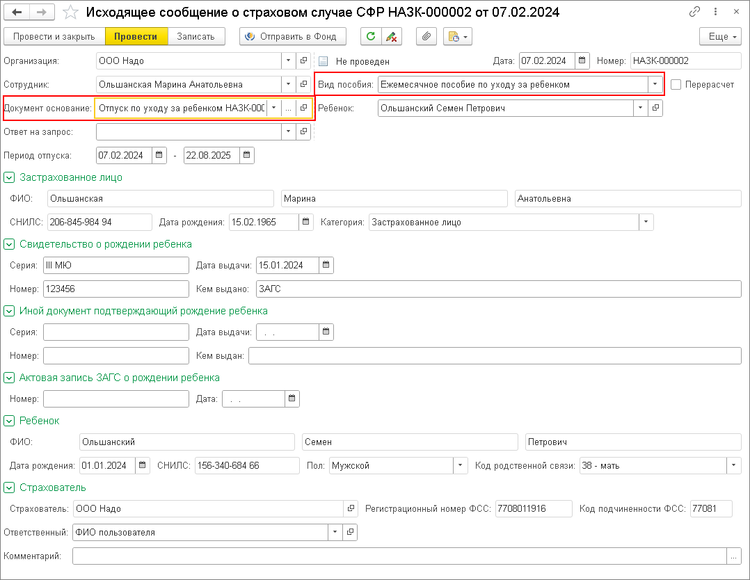Ежемесячное пособие по уходу за ребенком. Сведения в документе заполняются автоматически на основании кадровых данных сотрудника, информации из документа Отпуск по уходу за ребенком. Отправить сведения можно из документа по кнопке Отправить в фонд или из рабочего места Исходящие сообщения о страховых случаях СФР.
