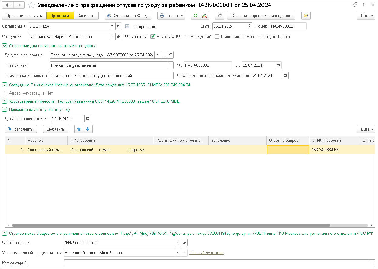 В программе после регистрации возврата сотрудника из отпуска по уходу за ребенком документом Возврат из отпуска по уходу (рис. 11) или при увольнении сотрудника документом Увольнение необходимо создать документ Уведомление о прекращении отпуска по уходу за ребенком (раздел Отчетность, справки – Передача в ФСС сведений о пособиях – кнопка Создать или из документов Увольнение, Возврат из отпуска по уходу по кнопке Создать на основании).