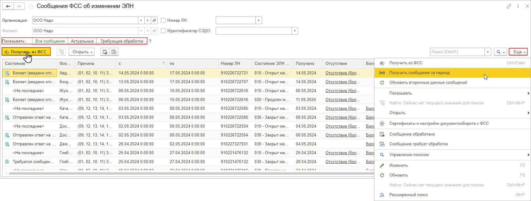 В программе уведомления об открытии больничного листа, продлении, закрытии, аннулировании поступают в рабочее место Сообщения ФСС об изменении ЭЛН (раздел Кадры - Сообщения ФСС об изменении ЭЛН) (рис. 1). Загрузка сообщений производится по кнопке Получить из ФСС. Для получения сообщений за определенный период нажмите на кнопку меню Еще - Получить сообщения за период. Подробнее о рабочем месте см. статью Сообщения от СФР об изменении статуса ЭЛН.Рис. 1