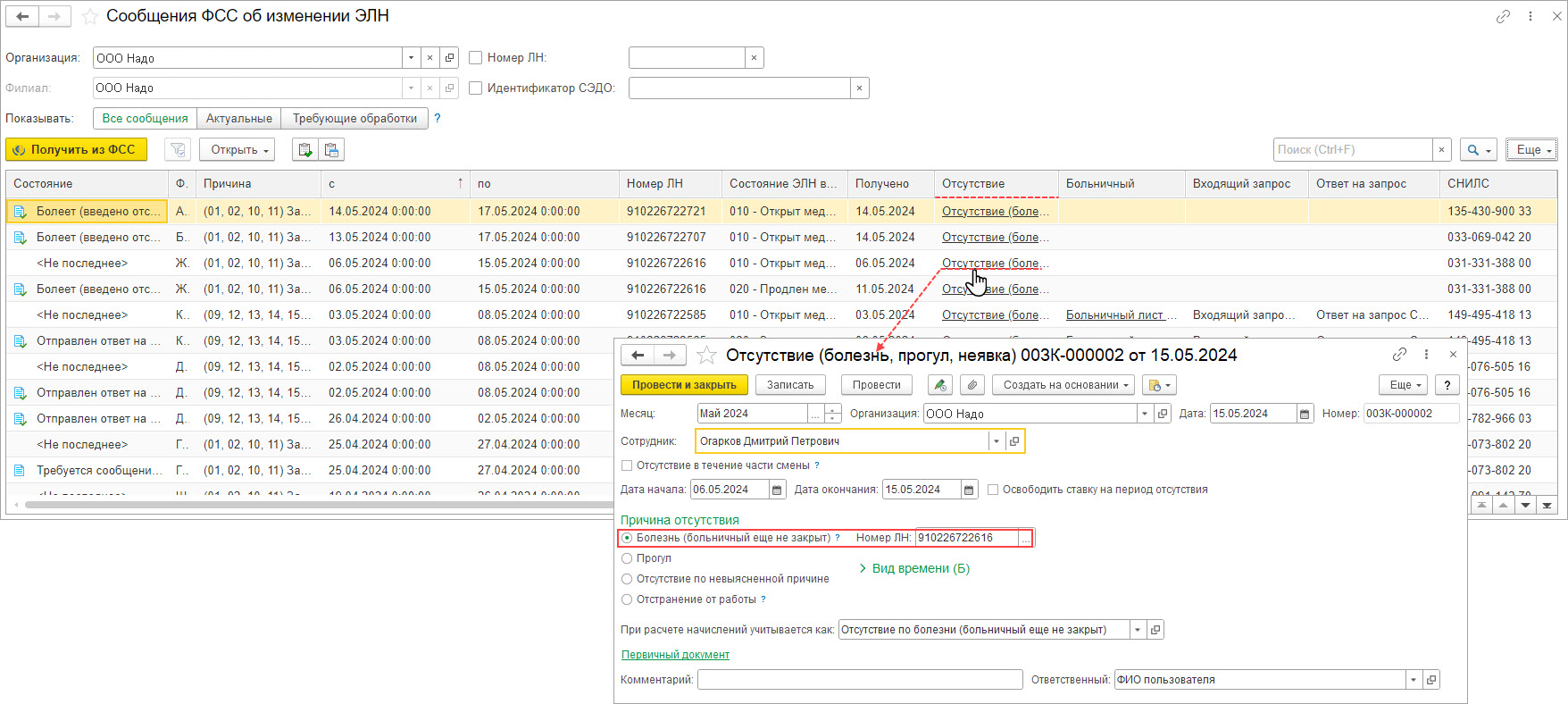 - Если больничный лист открыт, то можно при необходимости из рабочего места Сообщения ФСС об изменении ЭЛН создать документ Отсутствие (болезнь, прогул, неявка) (ссылка в колонке Отсутствие) (рис. 2).