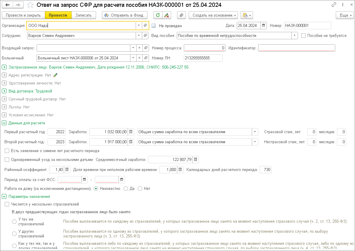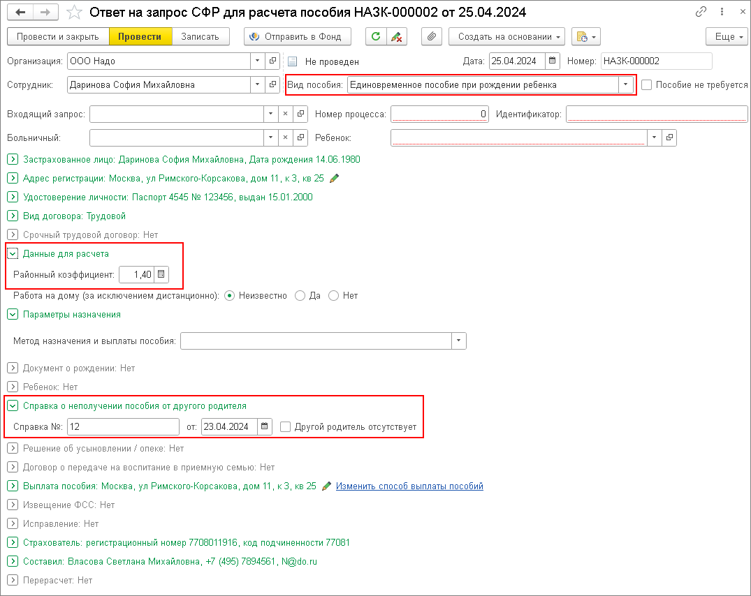 - Далее для формирования ответа на запрос фонда необходимо зарегистрировать документ Ответ на запрос СФР для расчета пособия. Документ можно создать из рабочего места Ответы на запросы СФР для расчета пособий (раздел Кадры) или на основании входящего запроса от СФР по кнопке Создать на основании (рис. 7). Проверьте заполненные сведения, обратите внимание на районный коэффициент, т. к. он влияет на размер пособия, а также внесите реквизиты справки второго родителя о том, что он пособие не получал. Можно непосредственно из программы отправить ответ в фонд по кнопке Отправить в Фонд.