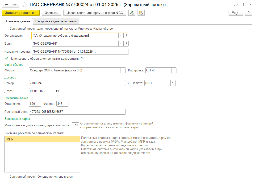 - в поле Зарплатный проект указать договор учреждения с банком о перечислении денежных средств на лицевые счета сотрудников, открытые в этом банке