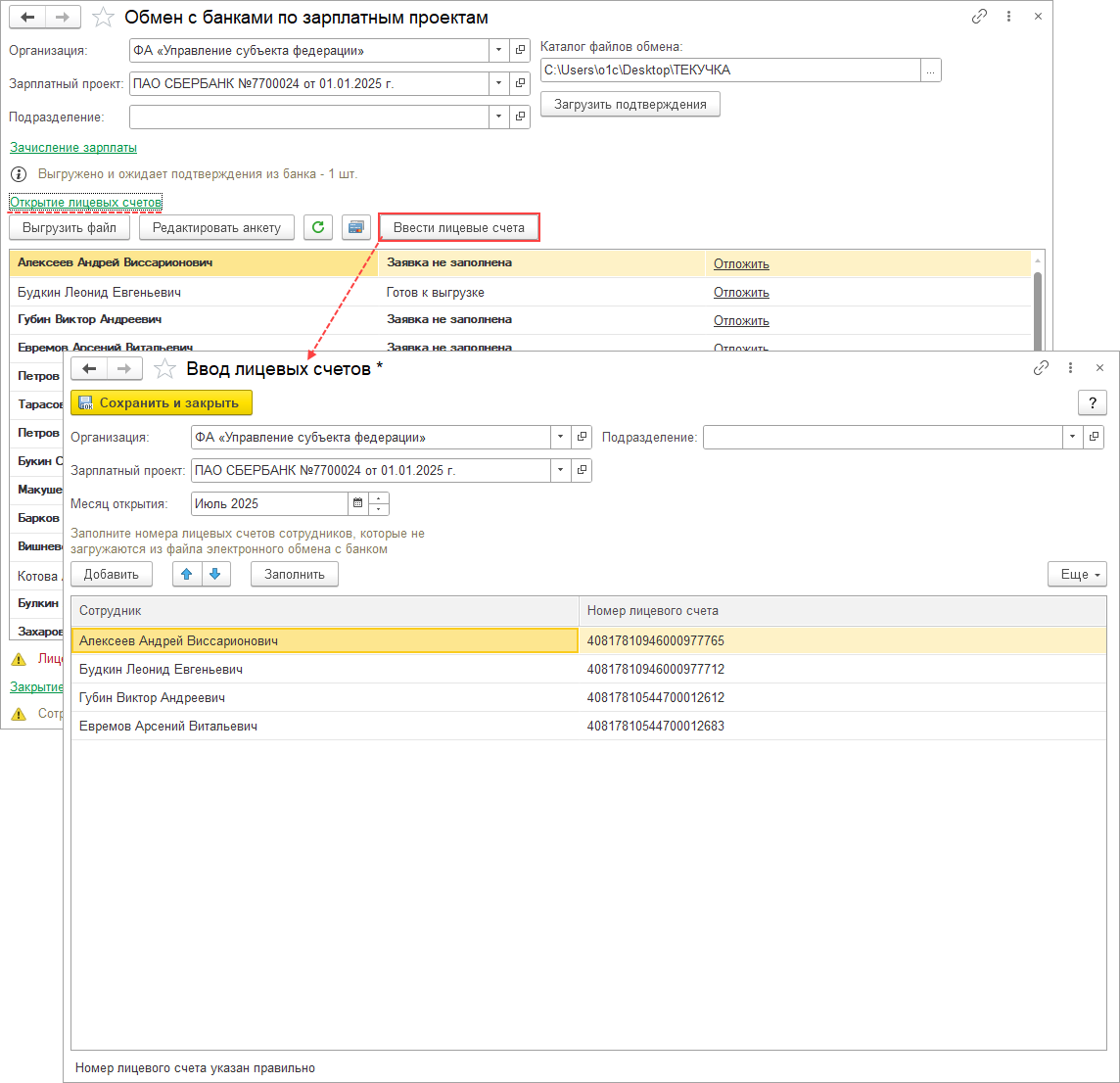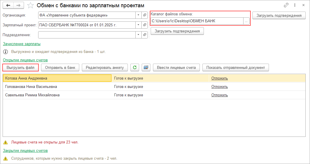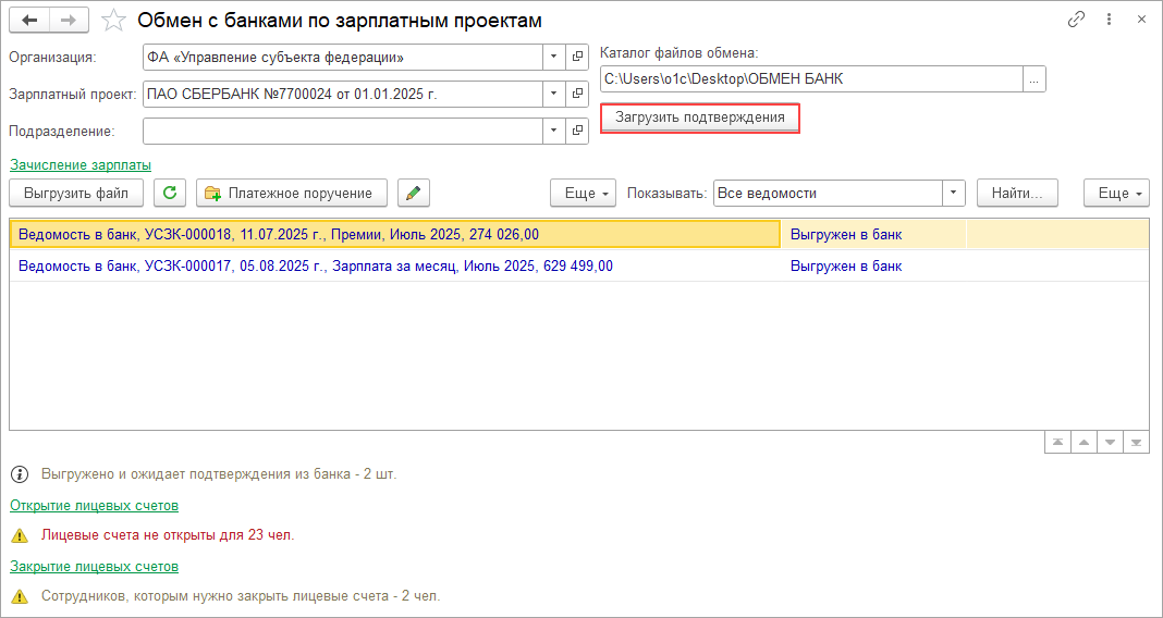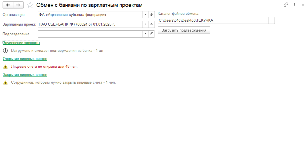 - загрузить подтверждение из банка о результатах открытия лицевых счетов (из переданного банком файла)