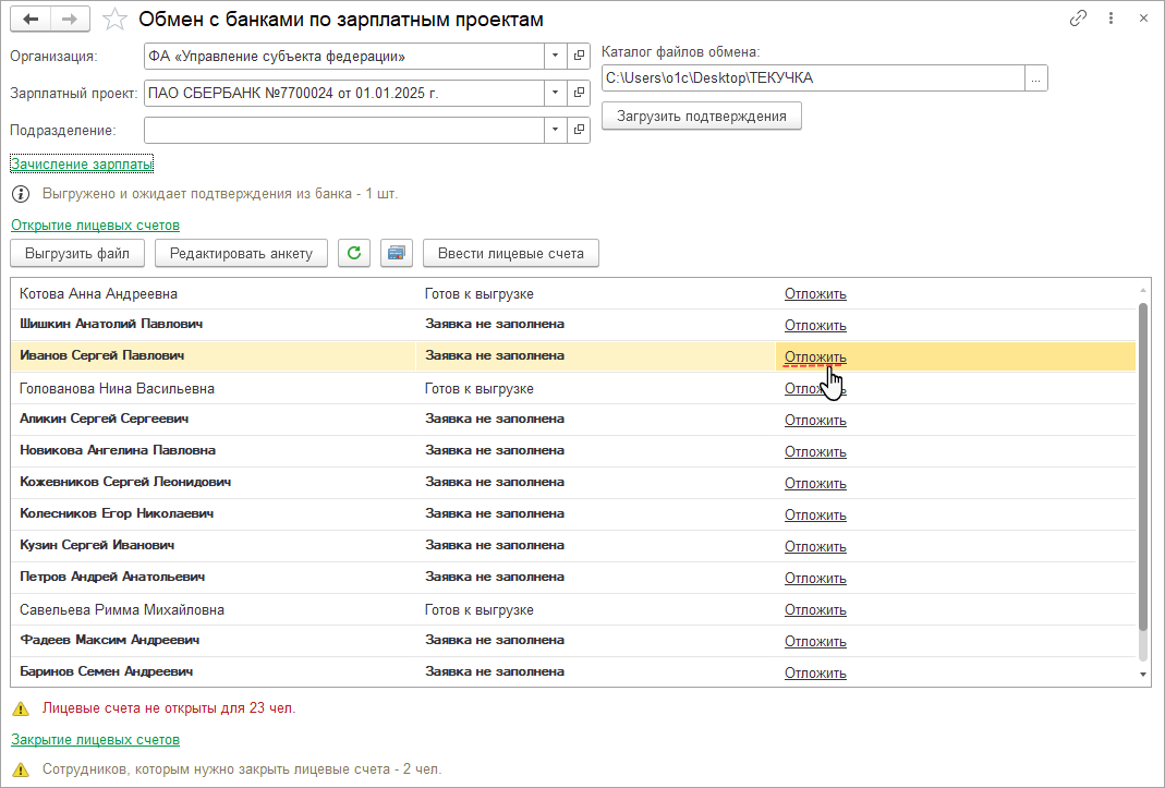 Если кому-то из сотрудников, отображенных в табличной части, не планируется открывать лицевые счета пока (например, не полностью заполнена анкета) или совсем (например, сотрудник получает зарплату через кассу), то заполнение заявки но ним можно отложить нажатием на ссылку Отложить (рис. 3).