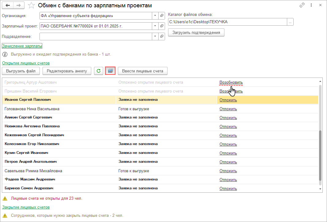 Повторное нажатие кнопки Показывать отложенное открытие лицевых счетов возвращает список в исходное состояние, когда в нем не отображаются "отложенные" сотрудники.