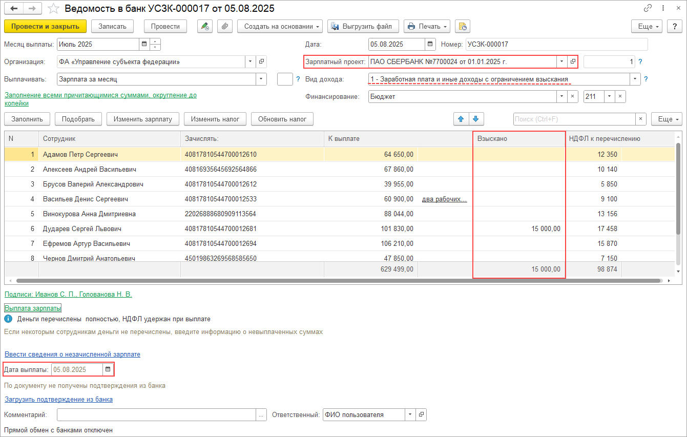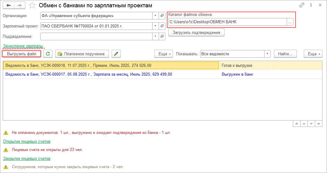 - выгрузить ведомости, которые требуется оплатить, в файл (для передачи его в банк)
