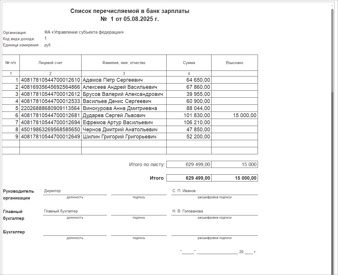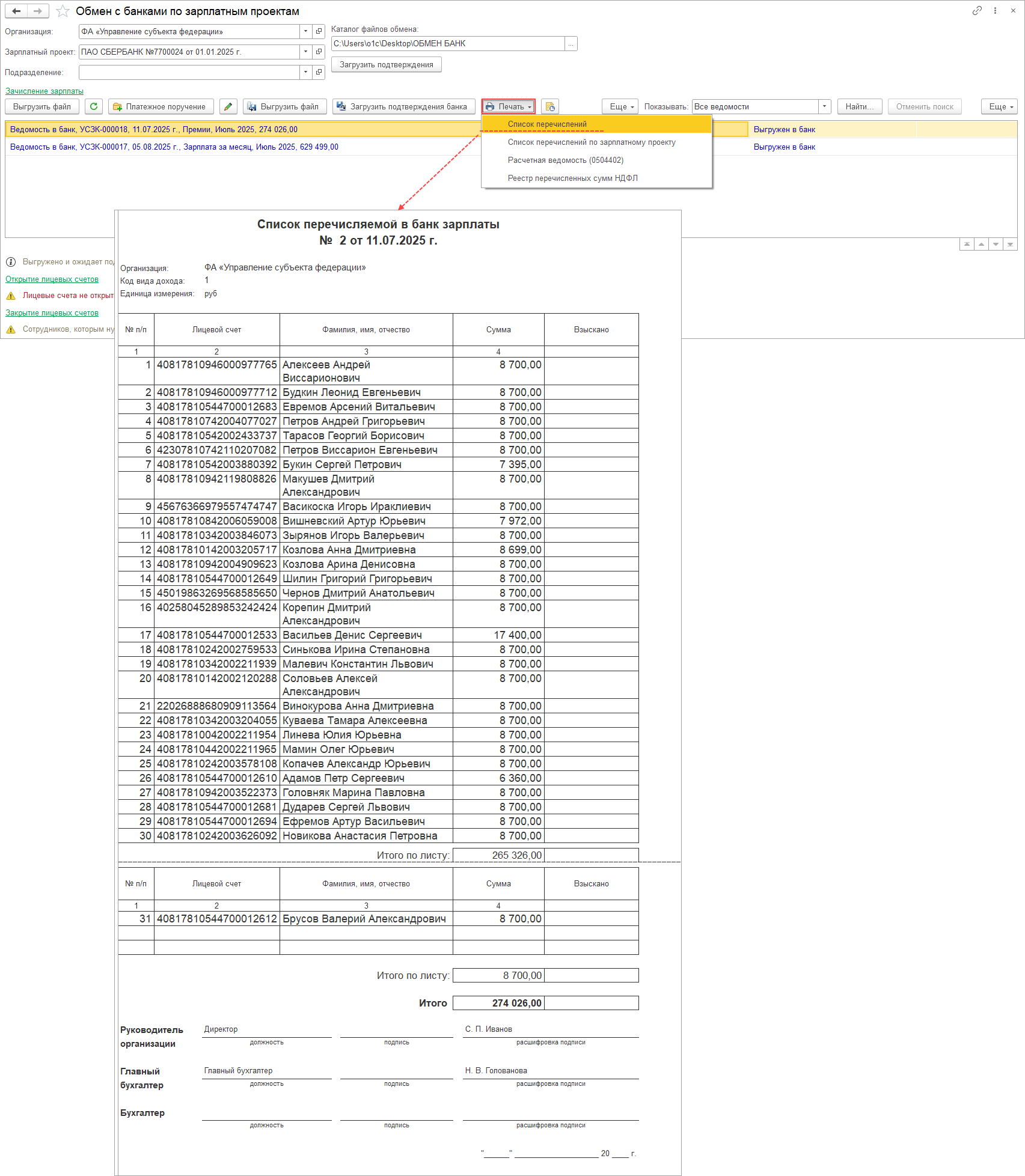 - сформировать печатную форму – список перечислений (для передачи его в банк)