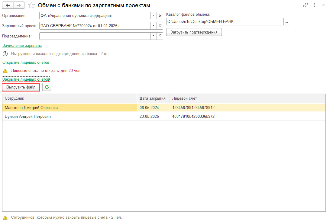 - подготовить заявки на закрытие лицевых счетов уволенных сотрудников и выгрузить их в файл (для передачи его в банк). Возможность доступа, начиная с версии 3.3 формата обмена.