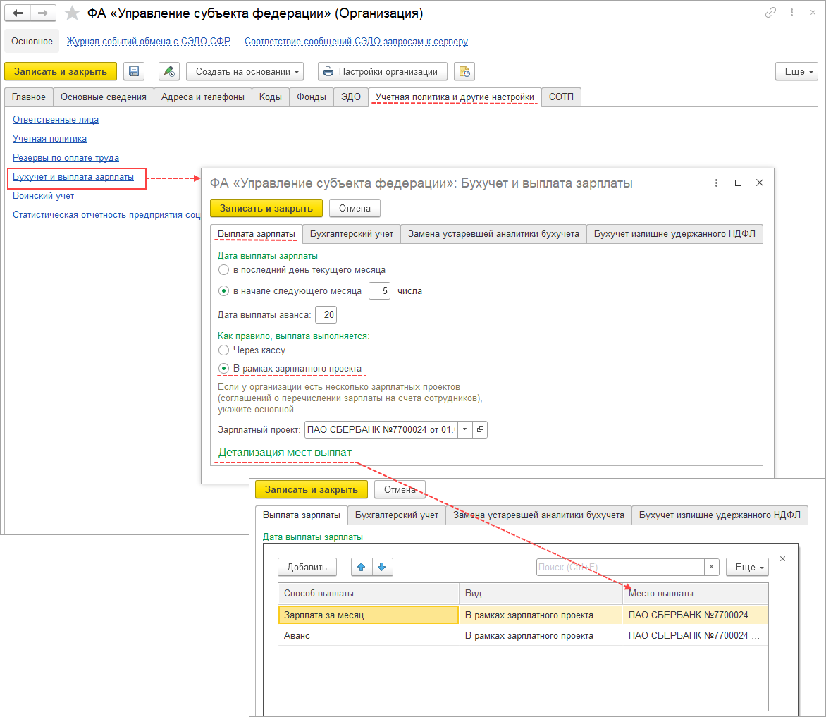 В карточке учреждения (раздел Настройка – Организации – закладка Учетная политика и другие настройки – ссылка Бухучет и выплата зарплаты - закладка Выплата зарплаты) нужно указать способ выплаты зарплаты Зачислением на карточку и созданный зарплатный проект (в случае использования в учреждении нескольких зарплатных проектов, необходимо выбрать основной) (рис. 2). По ссылке Детализация мест выплат можно настроить выплату разных выплат в разные банки.