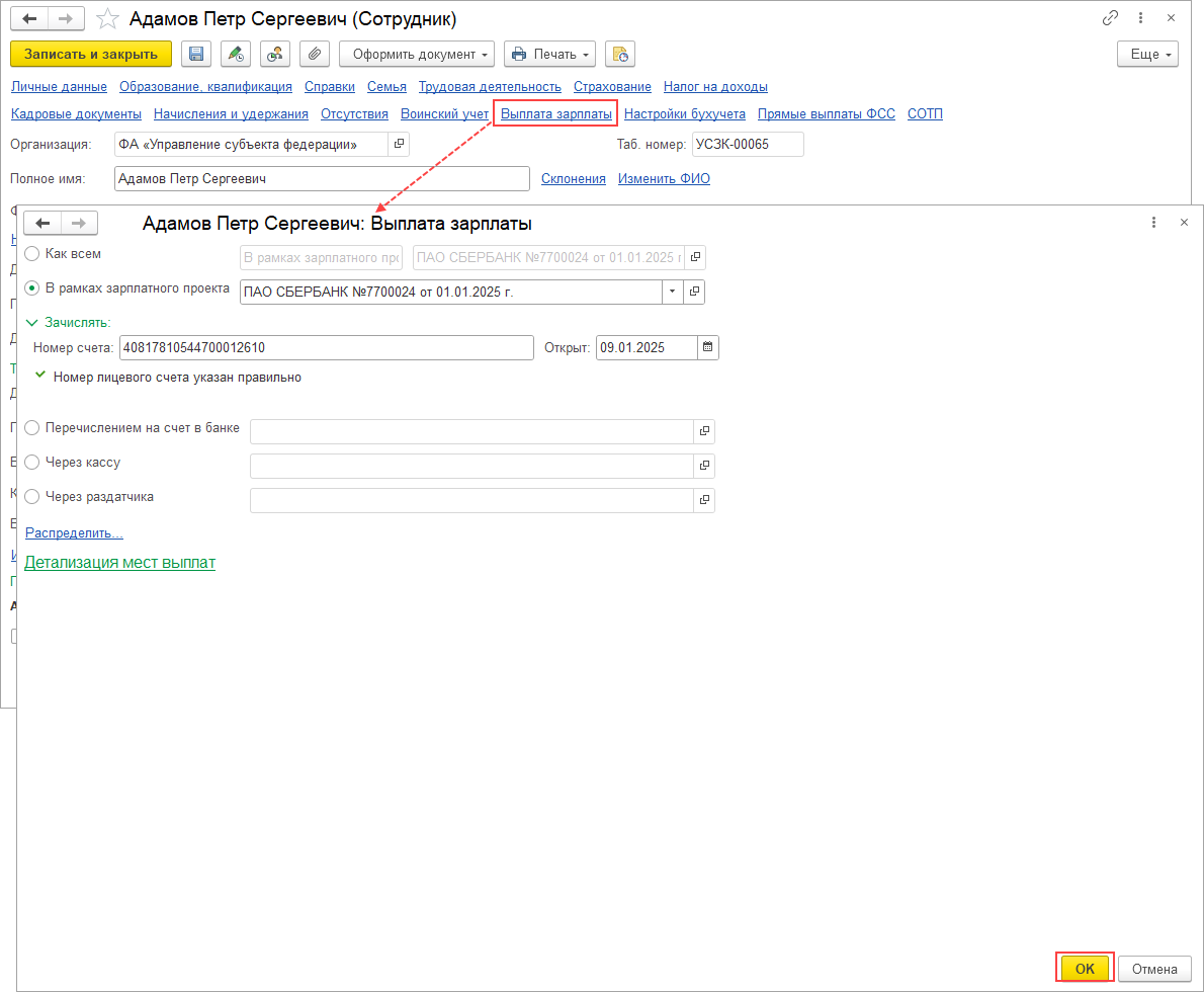 - для сохранения введенной информации о лицевом счете сотрудника нужно нажать на кнопку ОК.