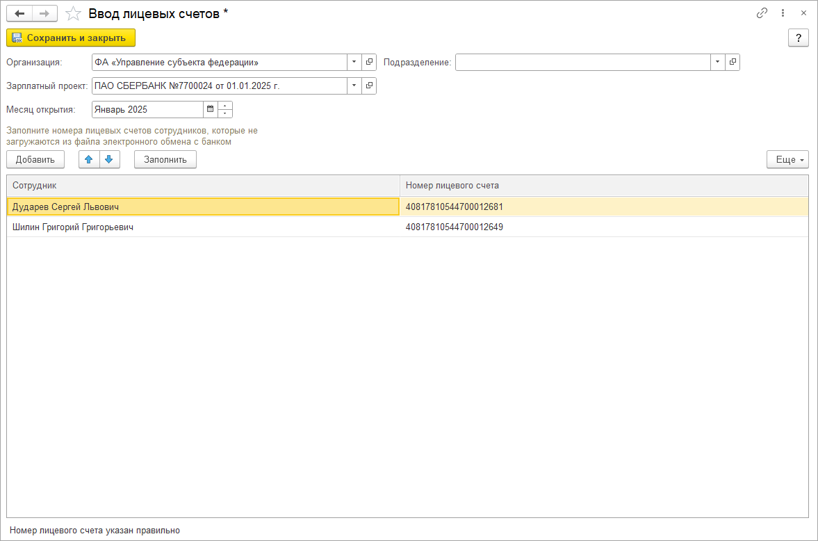 - табличная часть при нажатии на кнопку Заполнить автоматически заполняется сотрудниками, у которых на указанный месяц не введены сведения о лицевом счете в выбранного учреждения ни по одному зарплатному проекту. Добавить сотрудников в табличную часть можно и вручную, нажав на кнопку Добавить
