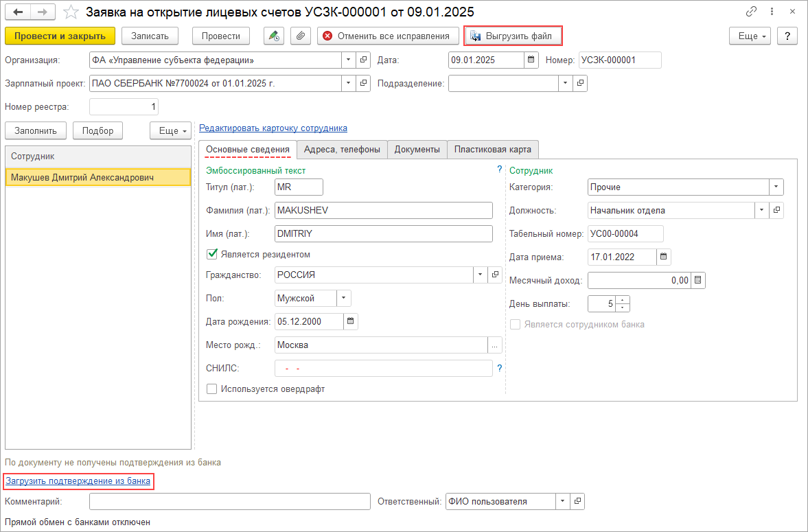 Когда все обязательные поля в Заявке на открытие лицевых счетов заполнены, в строке указывается, что сотрудник Готов к выгрузке. Документ Заявка на открытие лицевых счетов предварительно можно и не создавать. Документ может автоматически быть создан и проведен по готовым к выгрузке сотрудникам (не считая тех, по которым открытие лицевого счета отложено, – они не попадают в заявку) на текущую дату компьютера при нажатии на кнопку Выгрузить файл. По сотрудникам, заявка которых не заполнена, выгрузить ее в файл возможности нет.