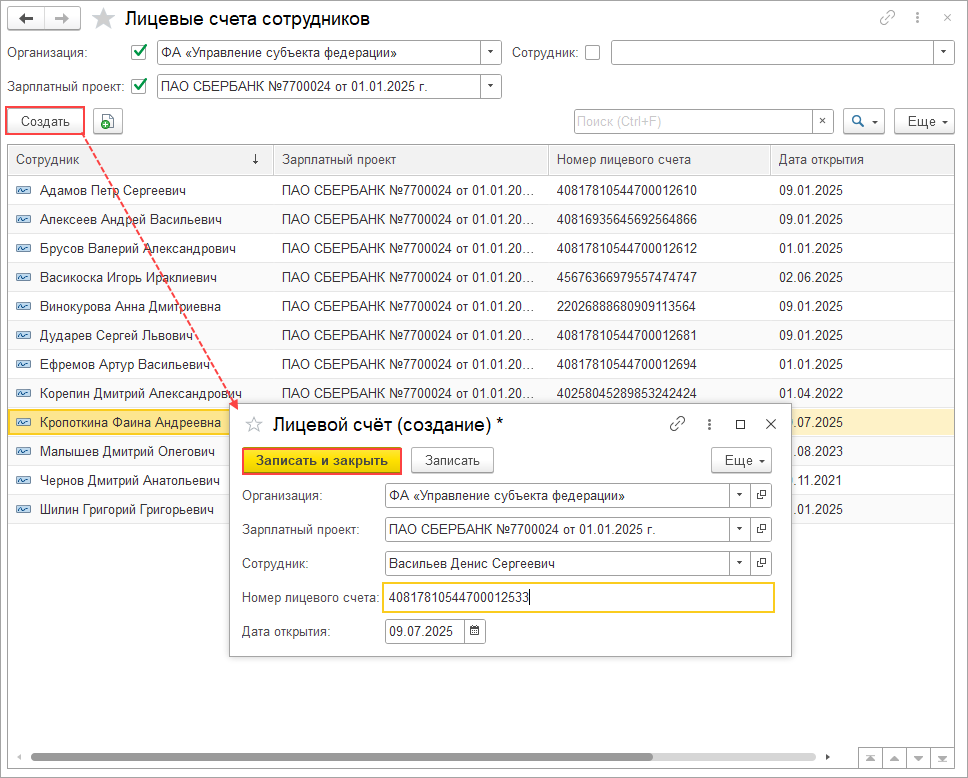- массовое открытие новых лицевых счетов всем сотрудникам, например, при переходе на новый зарплатный проект