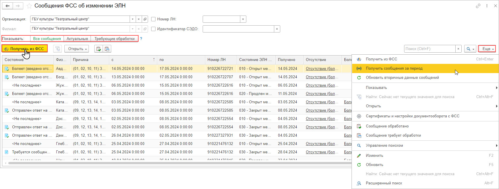 В программе уведомления об открытии больничного листа, продлении, закрытии, аннулировании поступают в рабочее место Сообщения ФСС об изменении ЭЛН (раздел Кадры - Сообщения ФСС об изменении ЭЛН) (рис. 1). Загрузка сообщений производится по кнопке Получить из ФСС. Для получения сообщений за определенный период нажмите на кнопку меню Еще - Получить сообщения за период. Подробнее о рабочем месте см. статью Сообщения от СФР об изменении состояния ЭЛН.Рис. 1