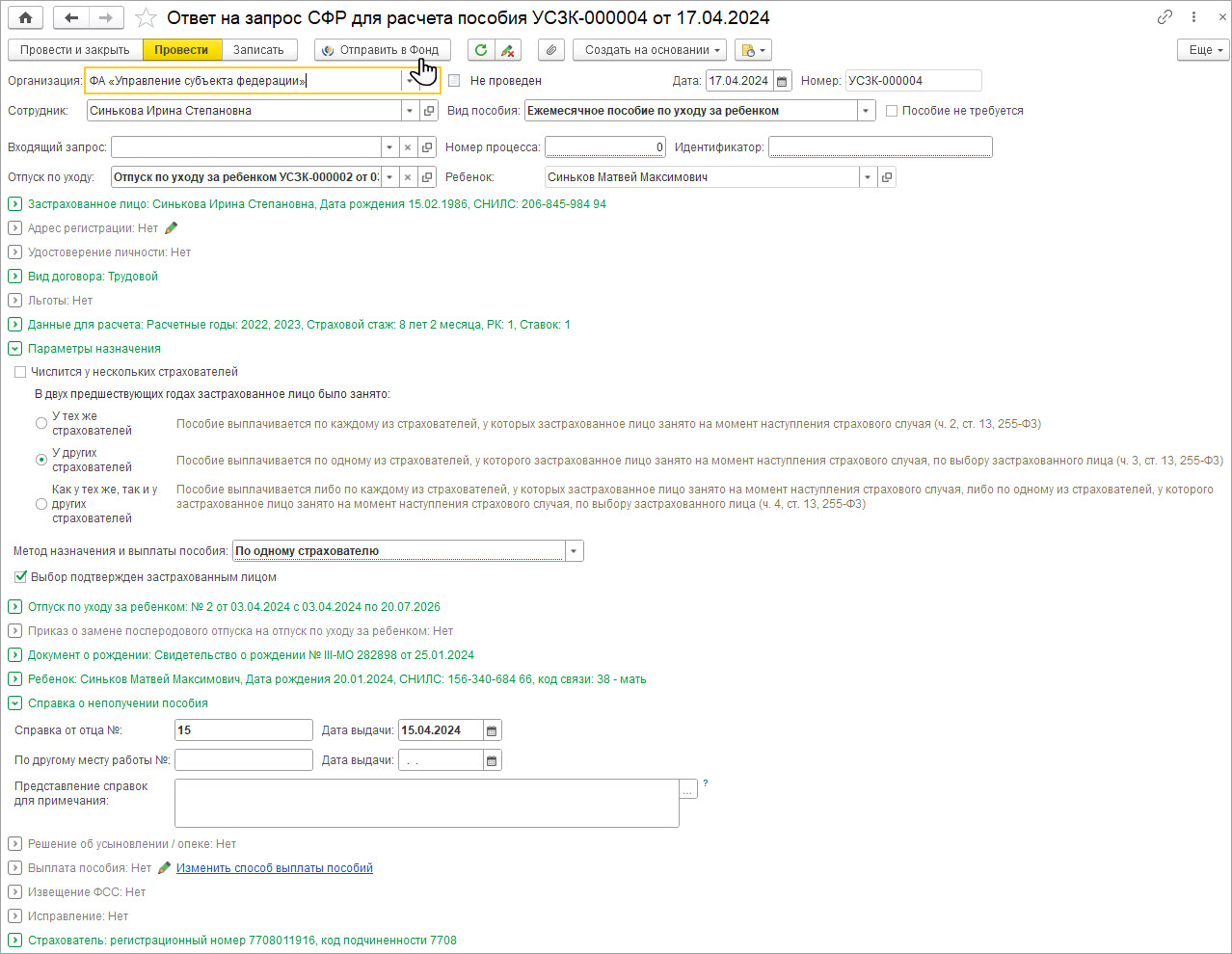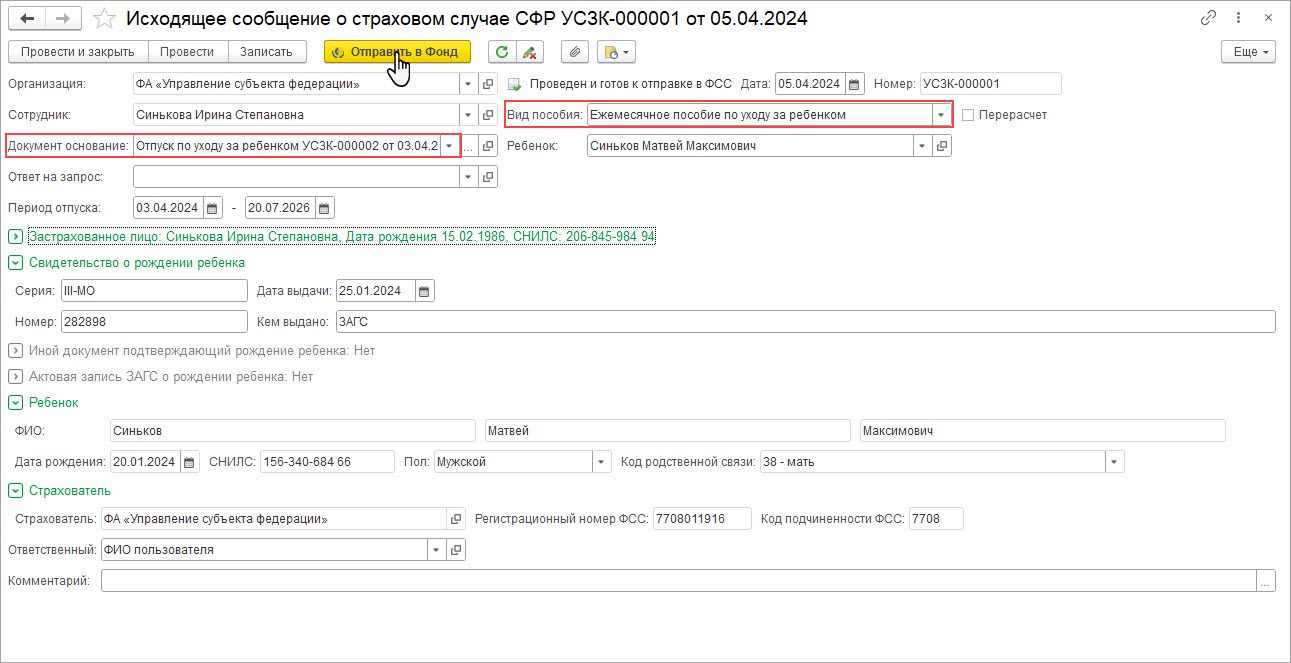 Ежемесячное пособие по уходу за ребенком. Сведения в документе заполняются автоматически на основании кадровых данных сотрудника, информации из документа Отпуск по уходу за ребенком. Отправить сведения можно из документа по кнопке Отправить в фонд или из рабочего места Исходящие сообщения о страховых случаях СФР, если подключен сервис "1С-Отчетность".